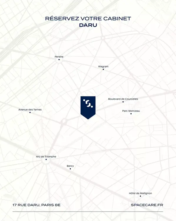 Recevez vos patients au 17 Rue Daru, 75008 Paris, dans un centre élégant, immédiatement opérationnel, conçu pour allier confort d’exercice et qualité d’accueil.