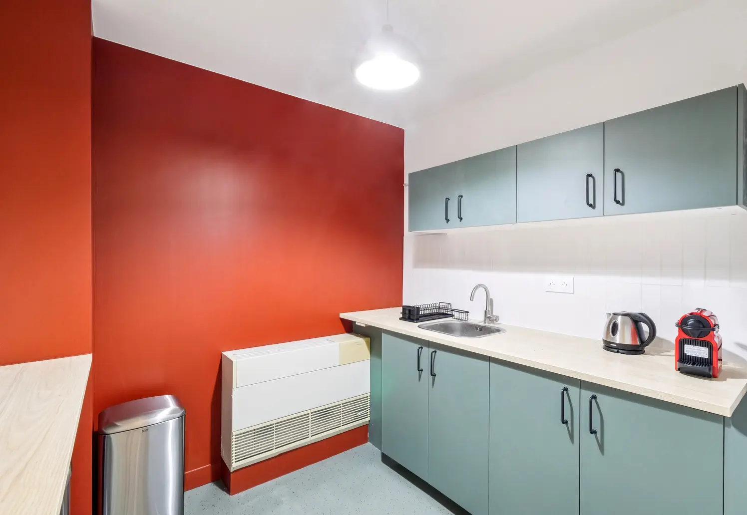Une belle salle d’attente, une cuisine équipée, sanitaires, rangement