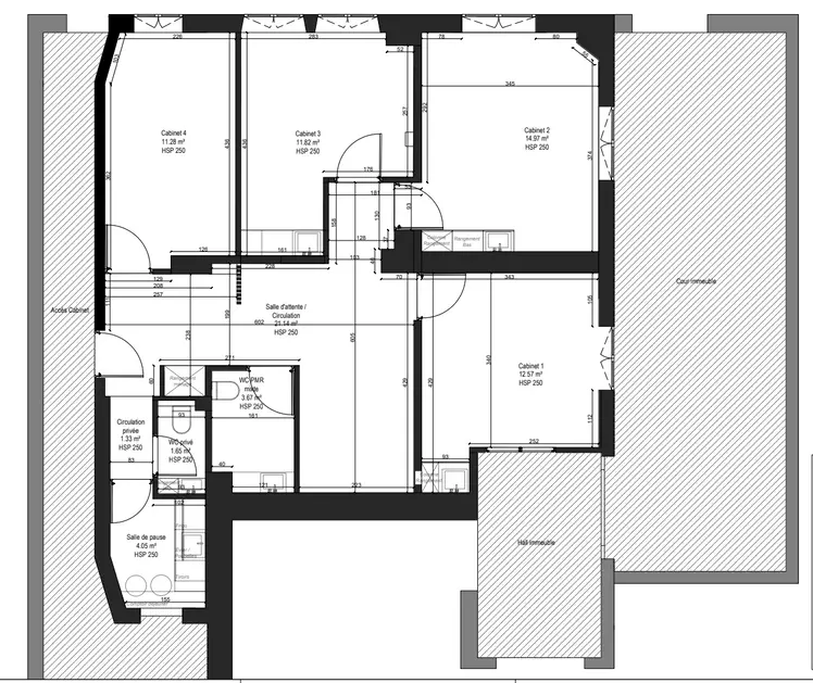D’une surface totale de 82 m², ce local en rez-de-chaussée offre une organisation optimale et fonctionnelle. Il se compose de quatre salles de consultation, d’une superficie comprise entre 10 et 14 m², toutes baignées de lumière naturelle grâce à de grandes fenêtres, dans une rue particulièrement calme — un véritable atout pour le confort des praticiens comme des patients.