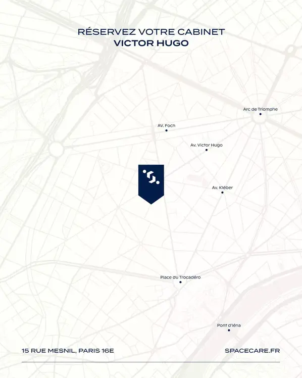 Installez votre pratique au 15 Rue Mesnil, 75016 Paris, dans un centre conçu pour offrir un environnement raffiné, rassurant et immédiatement opérationnel.