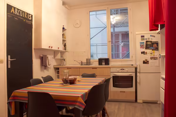 Coin commun cuisine équipé (réfrigérateur, micro ondes, cafetière, bouilloire)
