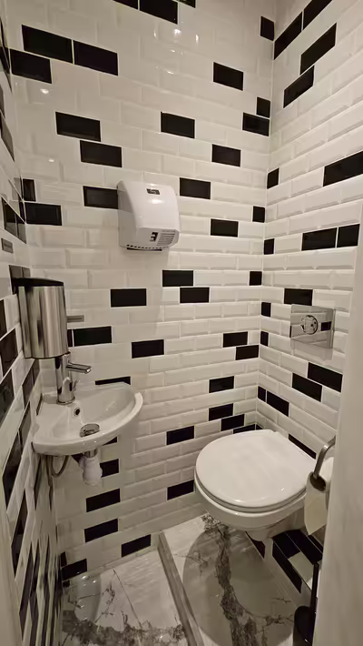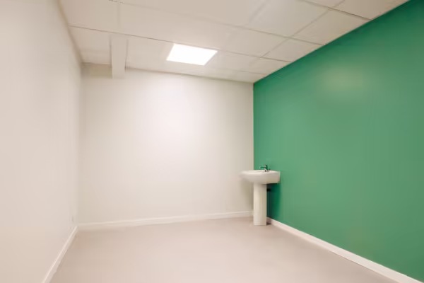 Il y a une salle d'attente, un cabinet de toilettes avec lavabo et un petit espace en sous sol avec un frigo,micro-onde et bouilloire.
