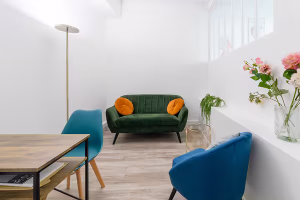 La location comprend également une salle d'attente commune, une petite cuisine équipée pour les professionnels et des sanitaires.