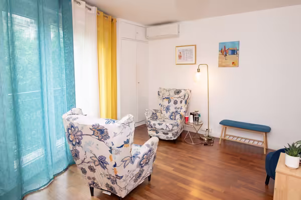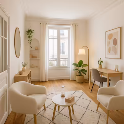 Le cabinet d'une superficie d'environ 18 m², fait partie d'un ensemble de trois bureaux, dont deux sont déjà occupés par des psychopraticiens. L'espace est conçu pour favoriser le calme et la confidentialité des échanges.