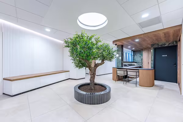 Cabinet de 80m2 comprenant 4 bureaux climatisés, une salle d'attente partagée, une kitchenette/salle de pause et des toilettes PMR.
