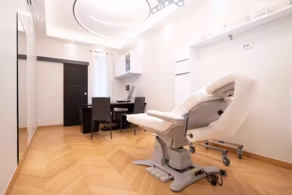 En option, une autre salle adjacente peut être disponible avec lasers 10m2 (CO2, Alexandrite, Nd-Yag), LED, Lumière Polarisée, Fotofinder (dernière génération Master ATBM) et un autre divan électrique.