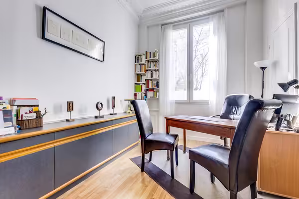 Situé au 2ème étage d'un bel immeuble haussmanien, donnant sur cour, très calme, le cabinet se compose d'une salle d'attente, d'un espace cuisine avec machine a cfé et a thé, micro-onde, et de deux bureaux de 12m2. Complètement meublé, chaque bureau se compose d'un bureau et de 2 ou 3 fauteuils selon la nécéssité. Des rangements sont possibles.