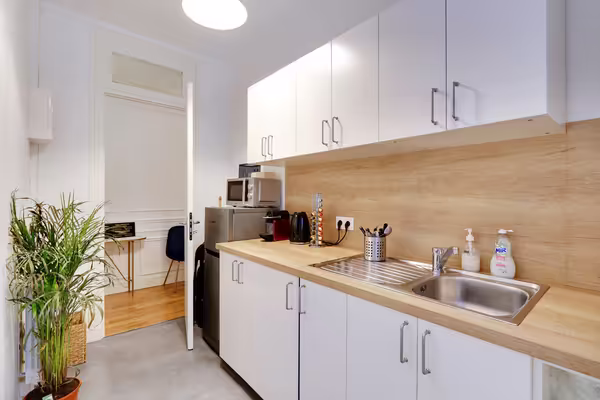 L'espace est composé d'une entrée/réception spacieuse, d'une salle adaptée à accueillir jusqu'à 6 stations de travail. Des travaux de qualité ont été réalisés récemment.
