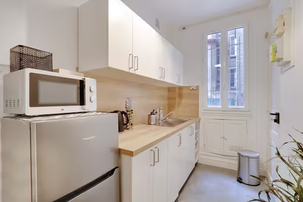 Cuisine kitchenette équipée (micro-ondes, machine à café, frigo...), WC, salle d'eau.